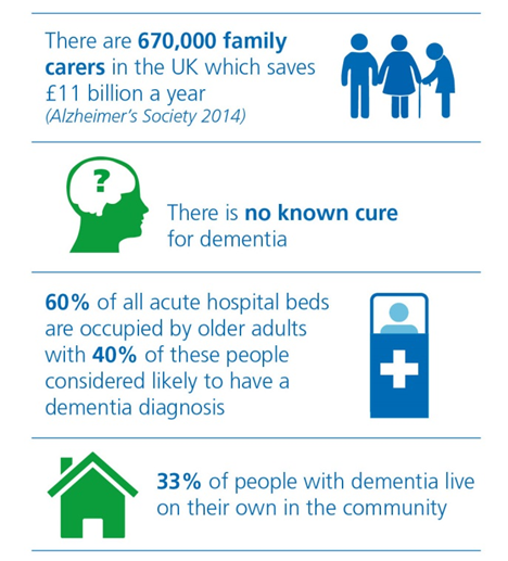 We also give carers and staff clear information and training. People with dementia may come into hospital for many reasons like infections, heart problems or falls and they often need extra help.
